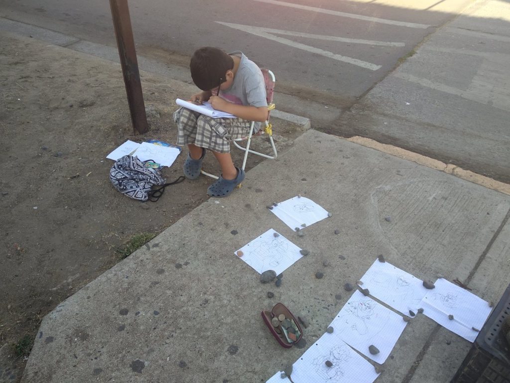 Ignacio tiene siete años, vive en la comuna de Quintero y en los últimos días fue captado en una esquina vendiendo los dibujos que hace de los personajes de Dragon Ball Z. ¿La razón? Necesita el dinero para poder comprar sus útiles escolares.
