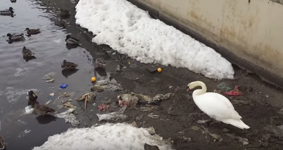 Precisamente restos de plástico fue lo que retiró un cisne antes de ingresar al agua. El registro audiovisual muestra cómo el animal mueve con su pico, uno a uno los desechos que le impiden nadar.