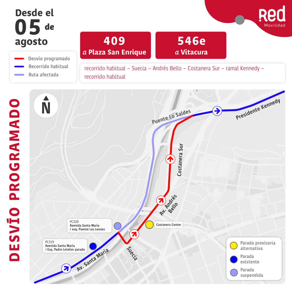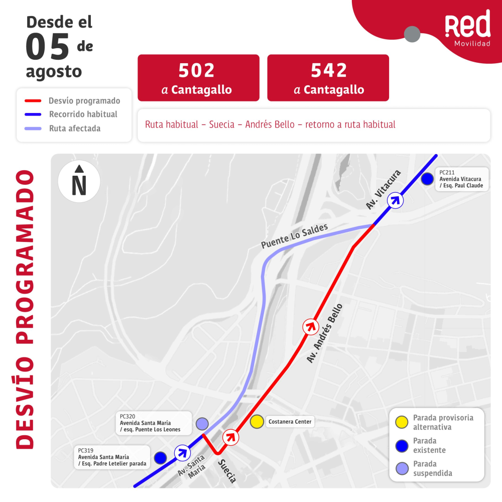 - 502 y 542: A través de Av. Suecia, Av. Andrés Bello para luego retomar la ruta habitual.
