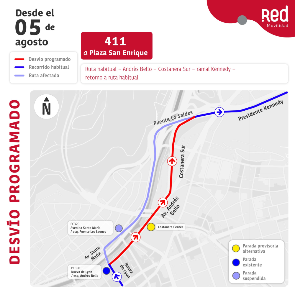 - 411: A través de Av. Andrés Bello, Costanera Sur, Ramal Kennedy para luego retomar ruta habitual.