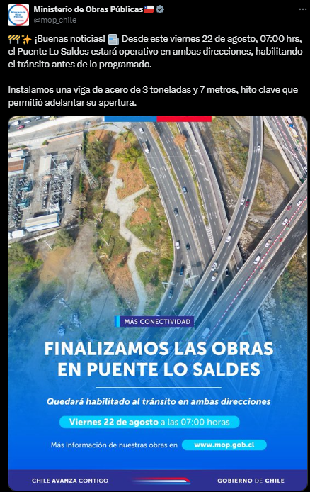 El Ministerio de Obras Públicas (MOP) anunció que el próximo viernes 22 de agosto el Puente Lo Saldes, en la comuna de Vitacura, quedará completamente habilitado, restableciendo el tránsito en ambos sentidos.