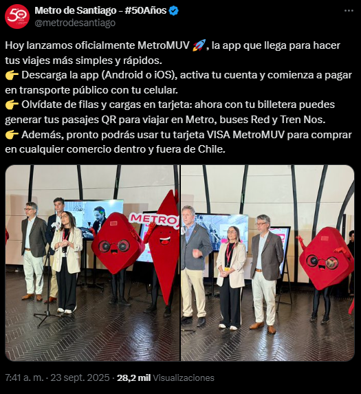 “También pueden viajar en buses interurbanos a otras ciudades del país a través de Kupos. En la misma aplicación de MetroMuv, puedes pagar colectivos con unas asociaciones de colectivos que ya están integrados en la aplicación y puedes pedir un taxi a través de la aplicación Clipp”, afirmó Carolina Iturra, gerente general de MetroPago.