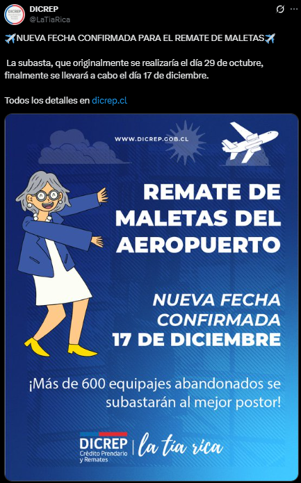 La Dirección General del Crédito Prendario (Dicrep), más conocida como Tía Rica, anunció uno de sus remates más esperados del año, que incluirá más de 600 maletas extraviadas en el Aeropuerto de Santiago.