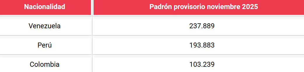 En cuanto a las nacionalidades con mayor número de electores en el padrón provisorio en Chile son: