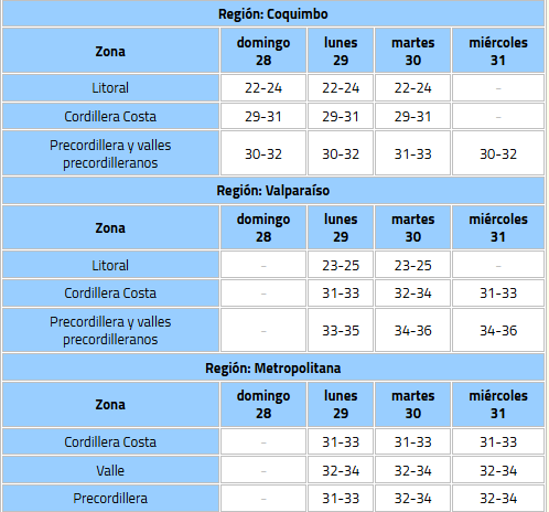 En el caso de la capital, para este fin de semana se pronostica que los termómetros alcancen los 32°C, mientras que en otros sectores de la Región Metropolitana, como las comunas de Lampa, Colina y Tiltil se podrían registrar máximas de 33°C.