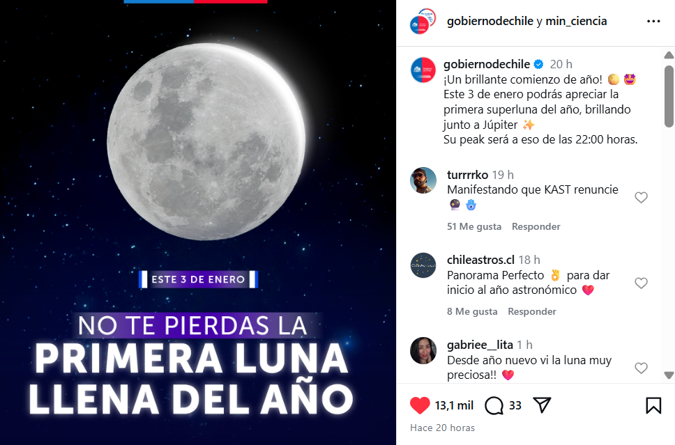 Según con los cálculos astronómicos, la fase llena exacta se producirá a las 10:02 UTC del 3 de enero, equivalente a las 07:02 horas en Chile continental. No obstante, el espectáculo podrá apreciarse desde la noche del viernes 2 y durante la madrugada del sábado 3, cuando el satélite ya aparecerá completamente iluminado en el cielo.