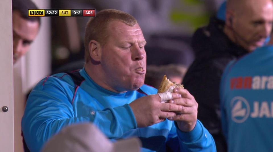 El partido entre el Arsenal y el club de la quinta división inglesa, Sutton United, llamó la atención no precisamente por lo futbolístico, sino por una polémica ajena al juego. El portero suplente del equipo, Wayne Shaw, de más de 100 kilos, fue sorprendido por las cámaras de TV comiendo un pie en la banca.