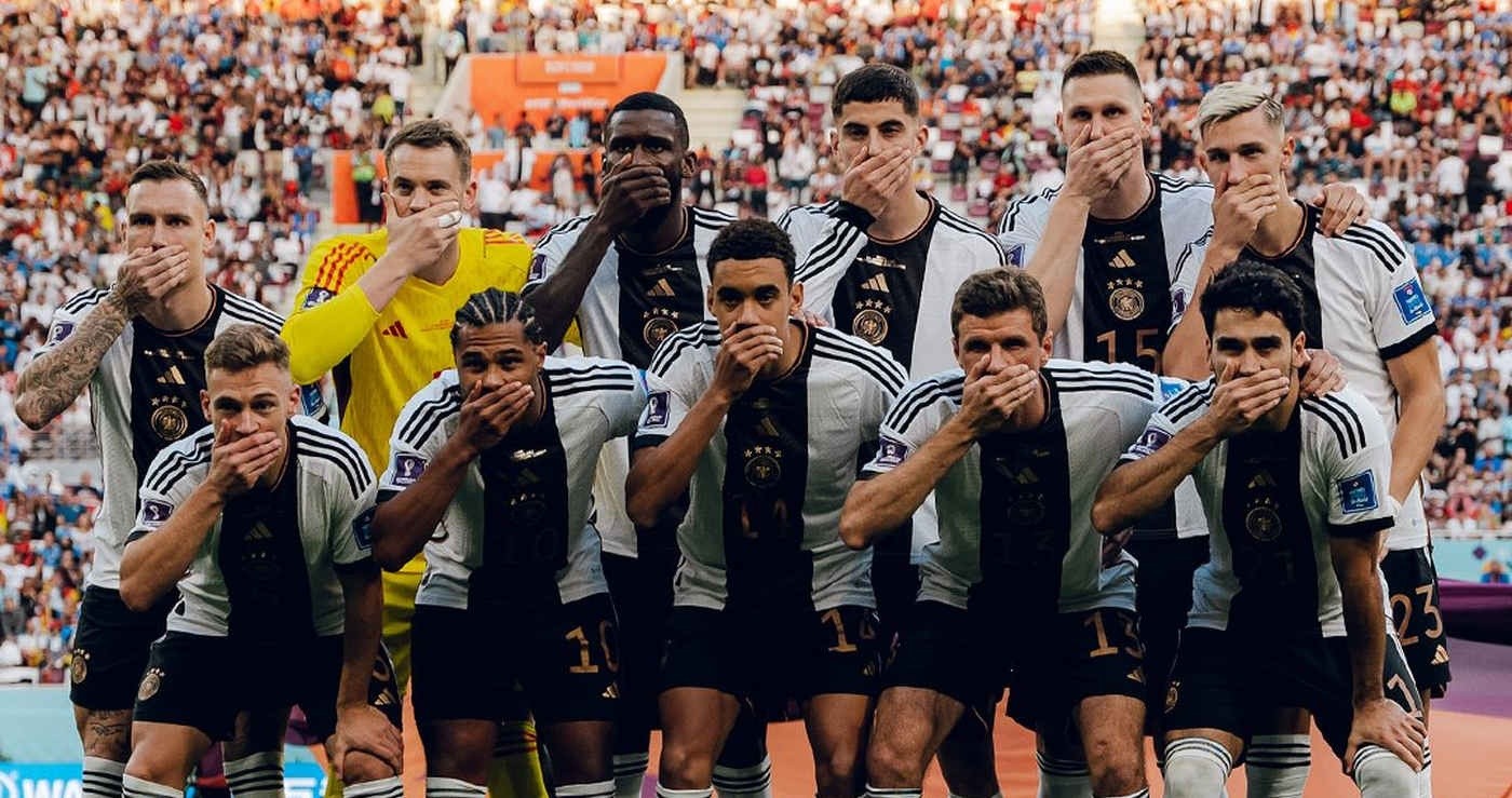 Momentos antes del inicio del encuentro ante Japón, los futbolistas germanos .comandados por su capitán, el arquero Manuel Neuer-, posaron para la tradicional fotografía de la oncena inicial con su boca cubierta, en una clara manifestación en contra de la censura.