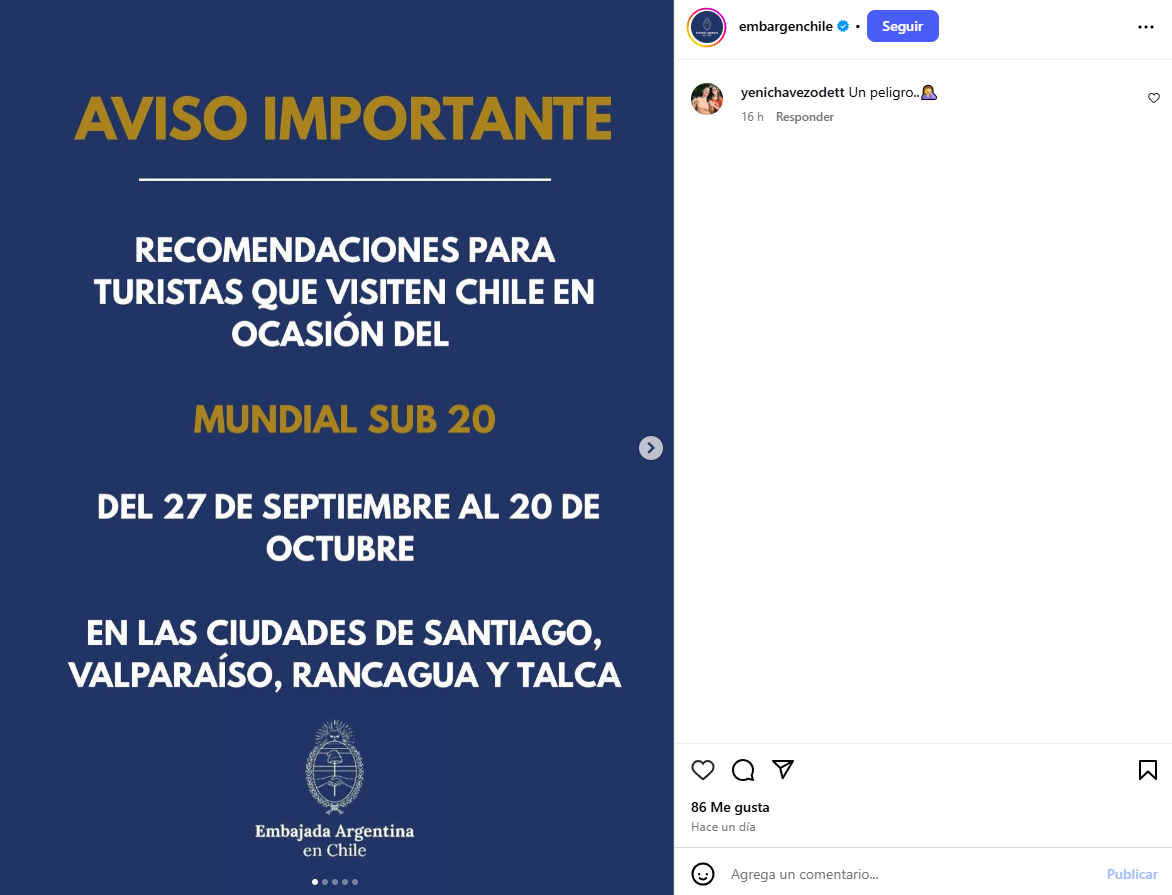 El comunicado comienza señalando que “la Embajada Argentina y su Red Consular en Chile recomiendan a aquellos turistas que visiten este país en ocasión del Mundial Sub 20, a disputarse entre los días 27 de septiembre y 20 de octubre en Santiago, Valparaíso, Rancagua y Talca deben tener en cuenta una serie de observaciones”.