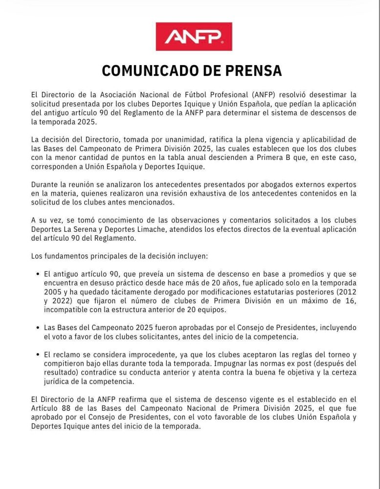 Finalmente, la ANFP recalcó que el reclamo de Iquique y Unión Española “se considera improcedente, ya que los clubes aceptaron las reglas del torneo y compitieron bajo ellas durante toda la temporada“.