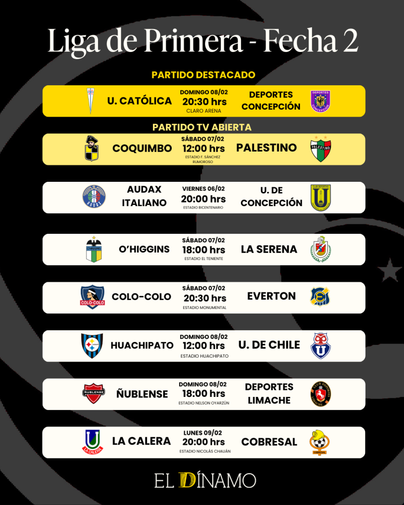 Por su parte, Universidad Católica jugará en horario estelar el domingo en el Claro Arena, donde recibirá a Deportes Concepción. Ambos saltarán a la cancha con la ilusión de obtener su primera victoria en el certamen.