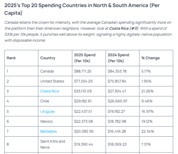 “Canadá se mantiene como líder en cuanto a intensidad, ya que el canadiense promedio gasta significativamente más en la plataforma que sus vecinos estadounidenses“, detalló el informe.