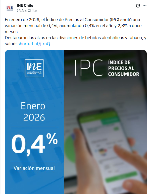 El Instituto Nacional de Estadísticas (INE) informó que durante enero de 2026 el Índice de Precios al Consumidor (IPC) registró un aumento mensual de 0,4%, acumulando la misma variación en lo que va del año y situando la inflación anual en 2,8%.
