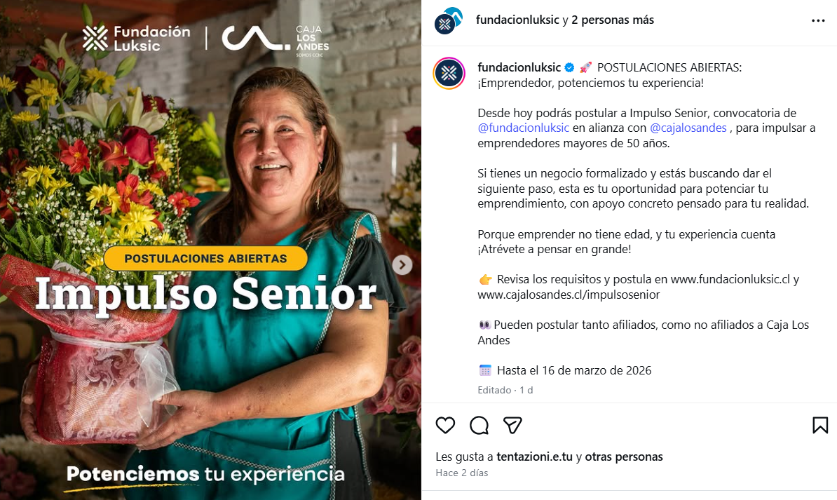 En este contexto, Fundación Luksic y Caja Los Andes se unieron para lanzar la segunda edición del programa Impulso Senior, dirigido a emprendedores mayores de 50 años. Este 2026, el programa ampliará su cobertura, beneficiando a 765 personas, quienes recibirán maquinarias semi industriales y herramientas de digitalización para profesionalizar sus procesos productivos.