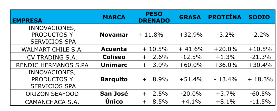 Respecto a las proteínas, las variaciones estuvieron entre –13,2% y +36%. La diferencia más baja correspondió a Barquito (–13,2%), mientras que los valores más altos se observaron en Unimarc (+36%), Acuenta (+20%) y Único (+8,1%).