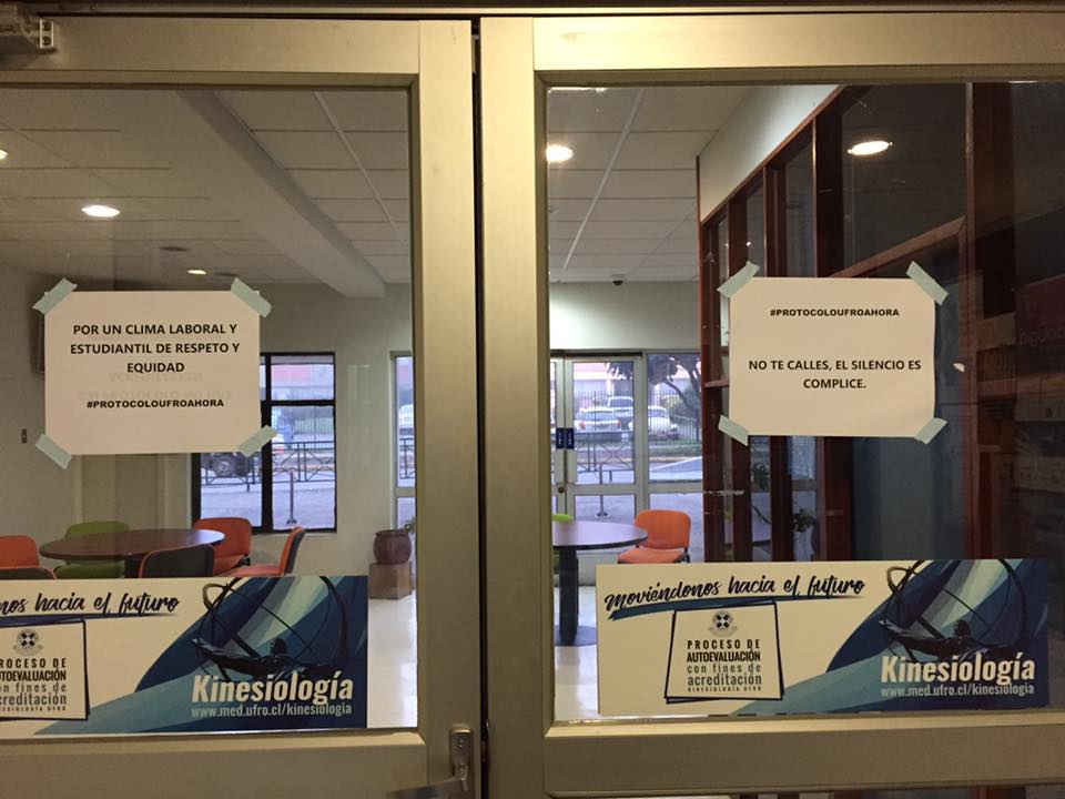 Algunos de los mensajes que pusieron las estudiantes decían “en la UFRO es más grave copiar que acosar” y “aquí me acosaron y nadie hizo nada”.