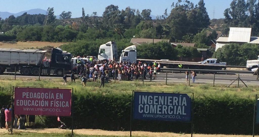 Estudiantes de la Universidad del Pacífico protestan en la Autopista del Sol, cortando el tránsito en la vía.