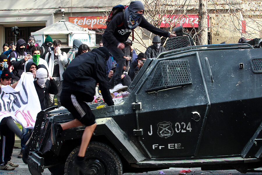 Al menos 30 detenidos y tres funcionarios de Carabineros lesionados dejó un “mochilazo” convocado por estudiantes secundarios, el que terminó con graves incidentes en el Paseo Bulnes de Santiago.