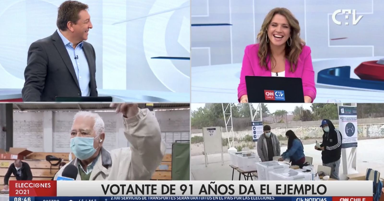 “Elecciones 2021 PM” conducido por la dupla debutante entre Mónica Rincón y Rafael Cavada, se impuso entre las 15:30 y las 17:55 con 8,6 puntos de rating online, por sobre TVN que obtuvo 4,9, Mega con 7,2, y Canal 13 con 4,2. Dicha transmisión revisó diversas problemáticas que enfrentaron algunos votantes, largas filas de algunos locales y el cierre de las primeras mesas del país.