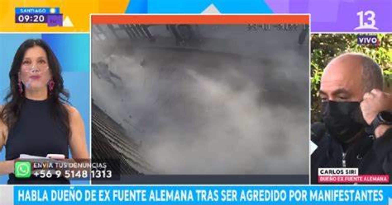 Mirna Schindler, una de las conductoras del matinal Tu Día de Canal 13, encaró a Carlos Siri, dueño de la ex Fuente Alemana, por usar un rifle a postones para defenderse del ataque de desconocidos el pasado viernes, en las ya clásicas protestas que se realizan en Plaza Italia.