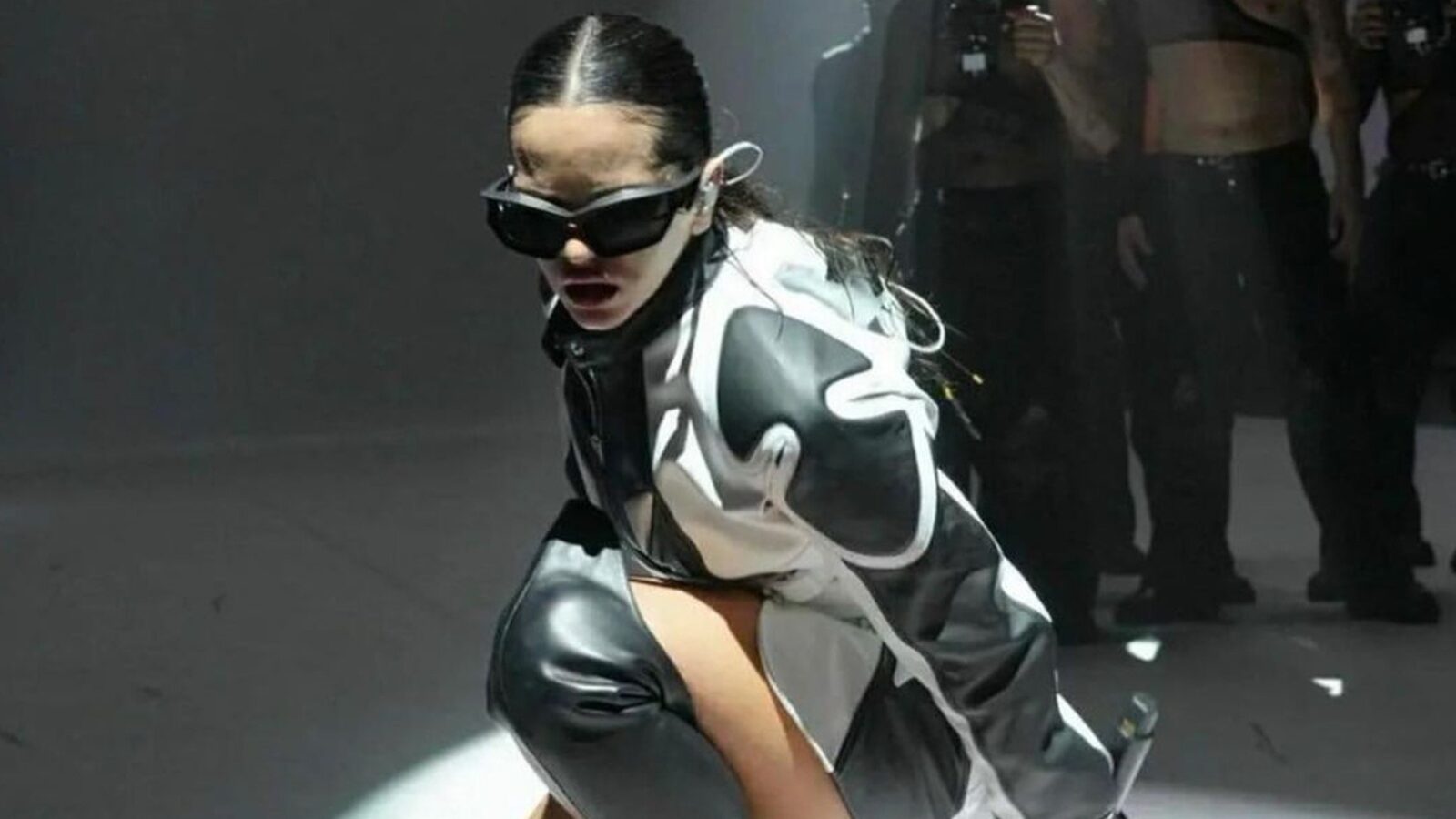 Rosalía lució un vestido lencero satinado de tirantes finos en color negro, el que combinó con un jersey y semi transparencias.
