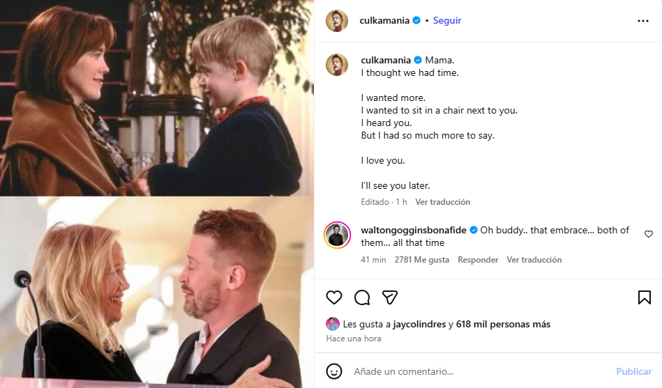 Con ese propósito, Macaulay Culkin posteó dos fotos junto a Catherine O’Hara, con 33 años de distancia entre una y otra. En la primera se los observa en una escena de la exitosa cinta que se estrenó en 1990, mientras que la otra los muestra cuando se reencontraron en 2023, durante la ceremonia en la que el actor recibió su estrella en el Paseo de la Fama de Hollywood.