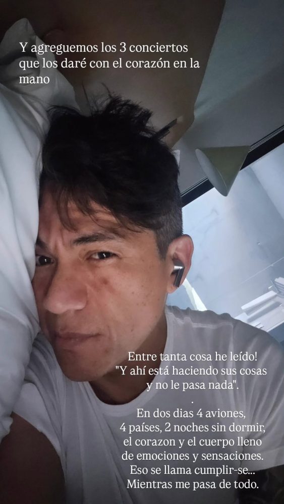 “Entre tanta cosa que he leído. Y ahí está haciendo sus cosas y no le pasa nada. En dos días, 4 aviones, 4 países, 2 noches sin dormir; el corazón y el cuerpo lleno de emociones y sensaciones. Esto se llama cumplirse… mientras me pasa de todo”, expresó el intérprete de cumbia.