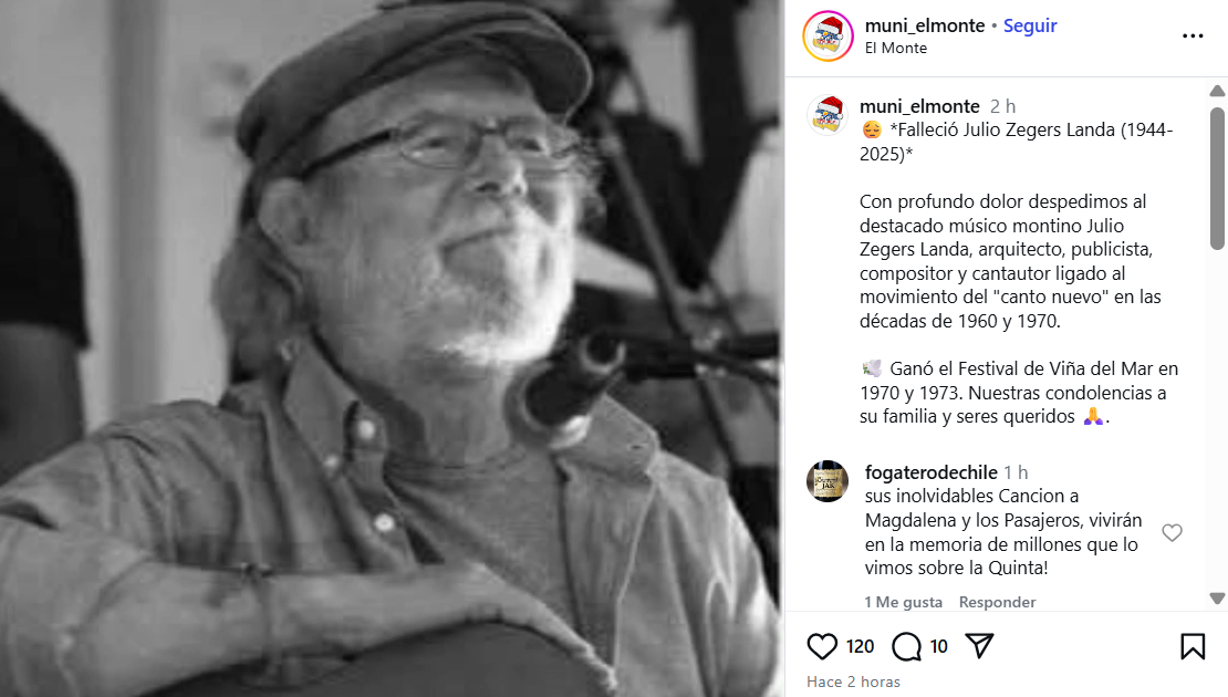 “Falleció Julio Zegers Landa (1944-2025). Con profundo dolor despedimos al destacado músico montino Julio Zegers Landa, arquitecto, publicista, compositor y cantautor ligado al movimiento del ‘canto nuevo’ en las décadas de 1960 y 1970”, señalaron desde el municipio, expresando además sus condolencias a la familia y personas cercanas.