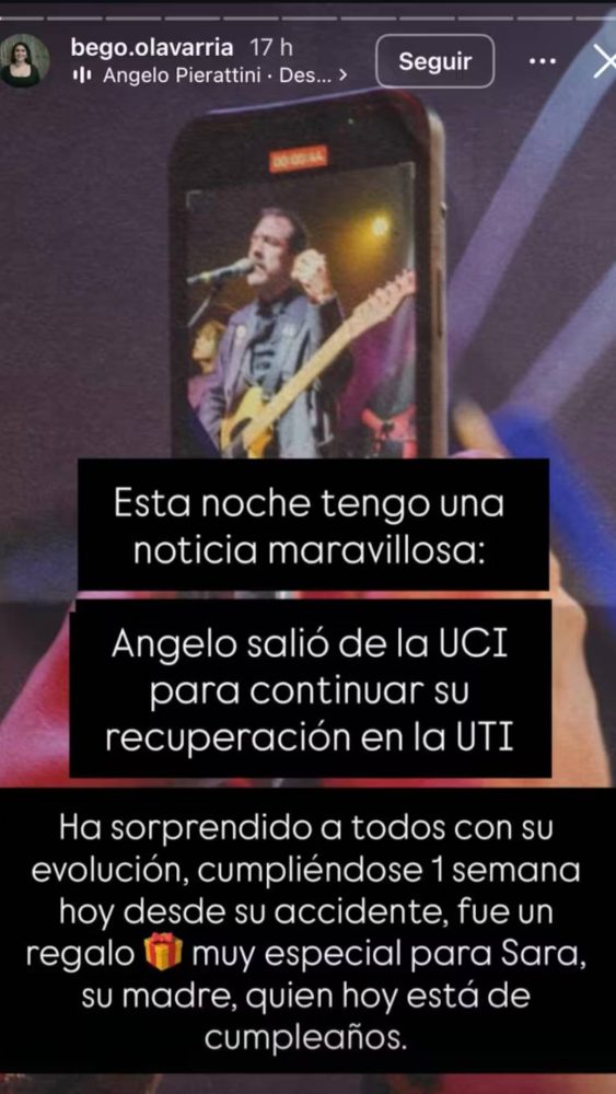 El compositor y guitarrista de la banda chilena Weichafe, Ángelo Pierattini, salió de la Unidad de Cuidados Intensivos (UCI), de acuerdo con lo que confirmó su esposa, Begoña Olavarría, a través de la cuenta de Instagram del músico.