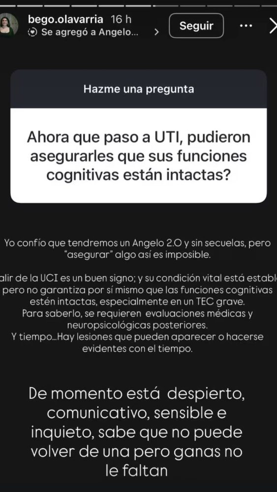 “De momento está despierto, comunicativo, sensible e inquieto. Sabe que no puede volver de una, pero ganas no le faltan“, posteó Begoña Olavarría en las historias del Instagram.
