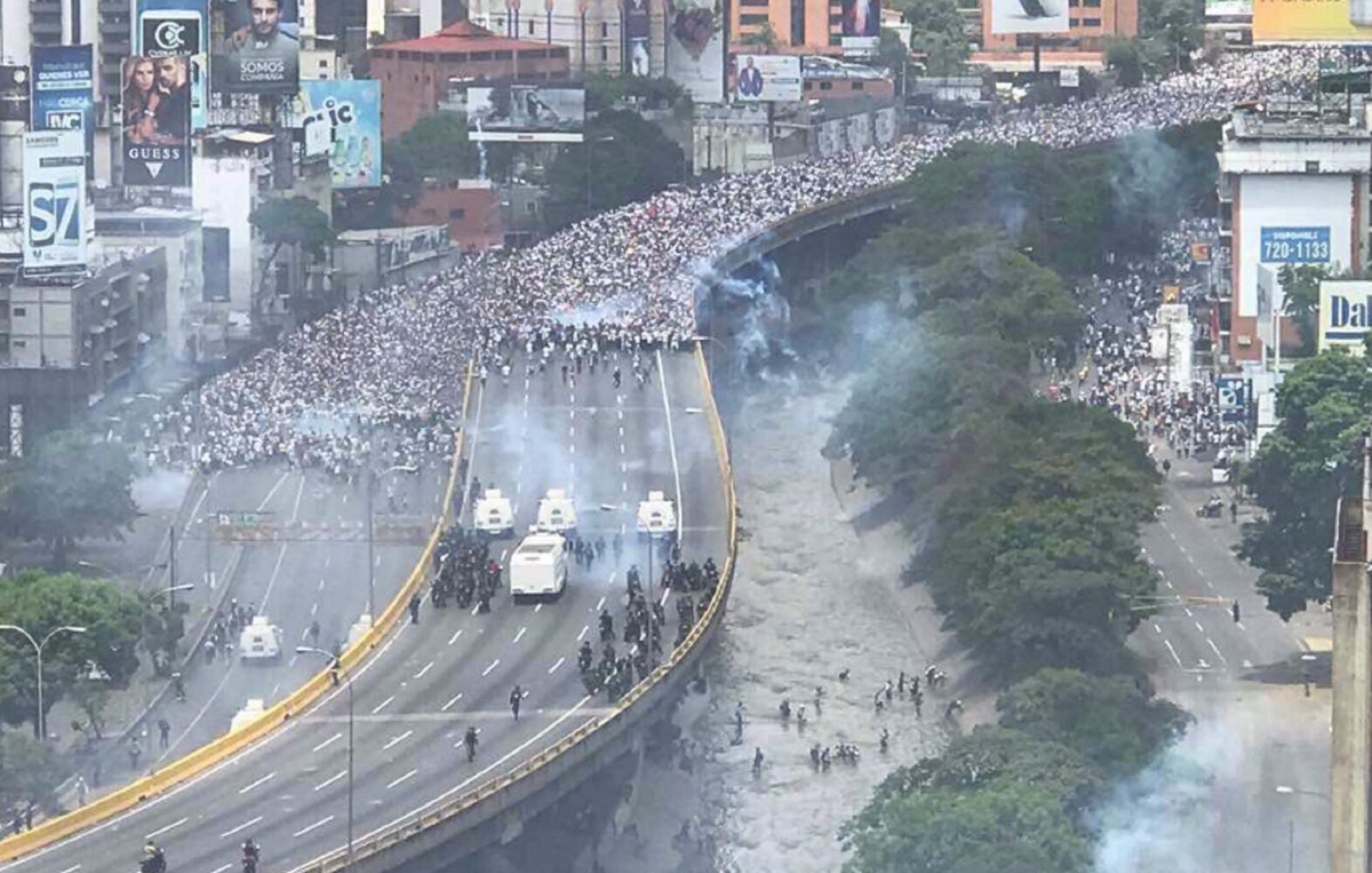La marcha de este miércoles, que dejó tres muertos, elevando a ocho los fallecidos en las manifestaciones de las últimas semanas, enfrentó la acción de las fuerzas de policía, y fueron disueltas con bombas lacrimógenas. En paralelo, el chavismo convocaba a una marcha, la que según Nicolás Maduro congregó a 3 millones de personas en la calle. Rápidamente surgió un video desmintiendo ese gentío.