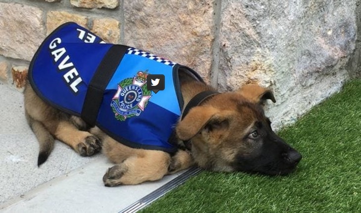 Se trata de Gavel, un ovejero alemán, que no pudo hacer carrera en la policía ya que terminaba la mayor parte del tiempo patas arriba para recibir cariño de las personas, además de moverle la cola a cualquiera que se le acercara.
