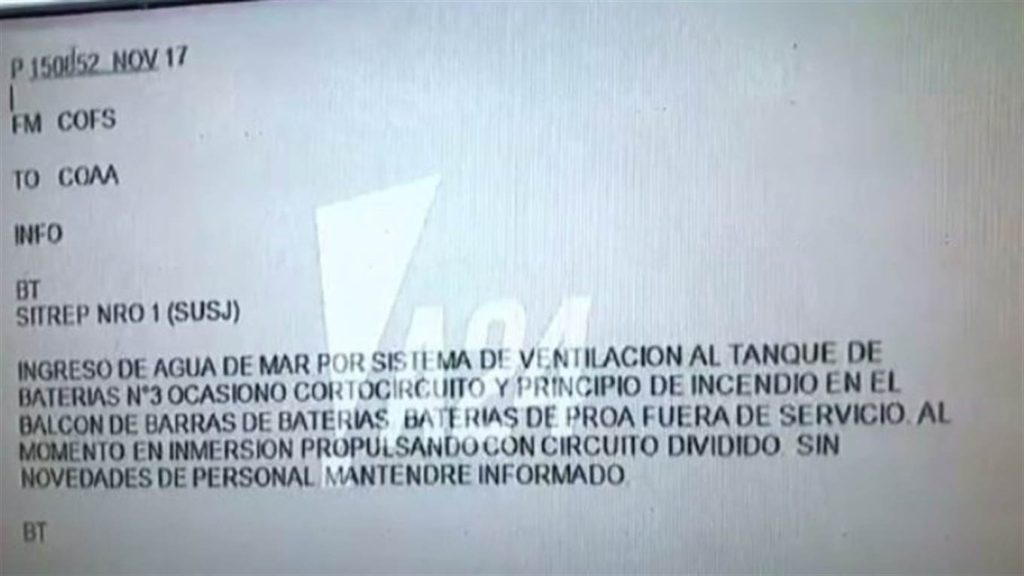 “Ingreso de agua de mar por sistema de ventilación al tanque de baterías N°3 ocasionó cortocircuito y principio de incendio en el balcón de barras de baterías. Baterías de proa fuera de servicio. Al momento en inmersión propulsando con circuito dividido. Sin novedades de personal mantendré informado”, se lee en el texto que fue replicado por La Nación.
