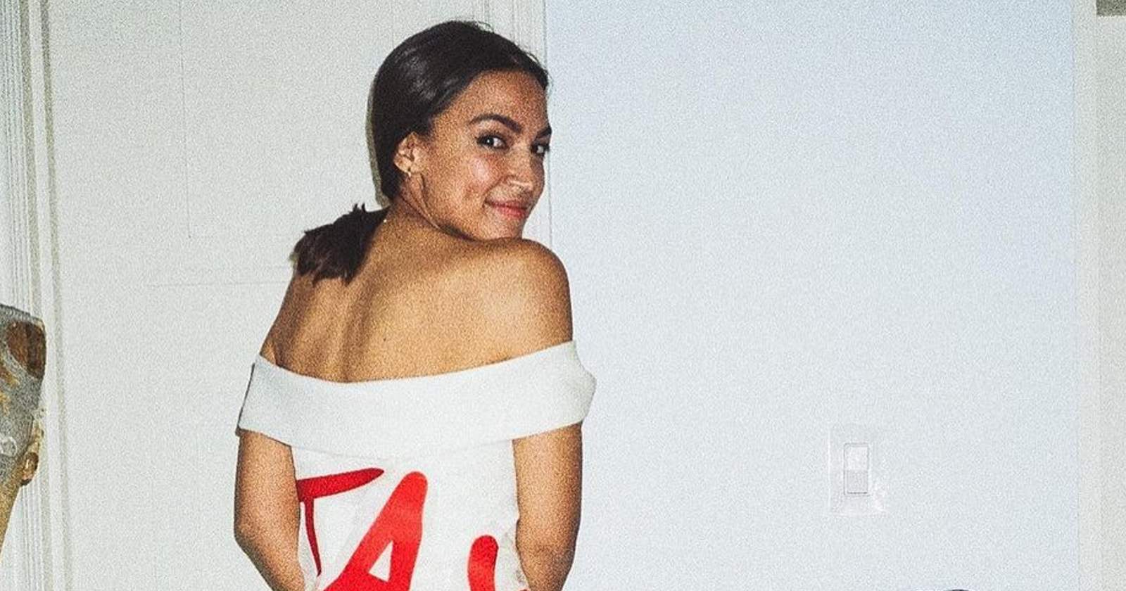 En su primera aparición en el popular evento, la demócrata de Nueva York usó un vestido blanco hasta el suelo con el estampado en rojo en la parte posterior que fue diseñado por Aurora James.
