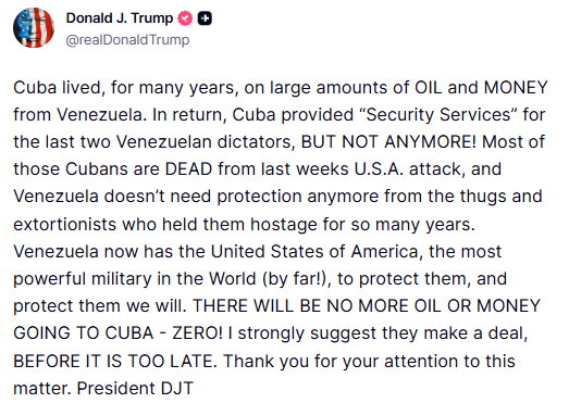 “¡No habrá más petróleo ni dinero para Cuba: cero!“, posteó el presidente estadounidense a través de su red Truth Social.