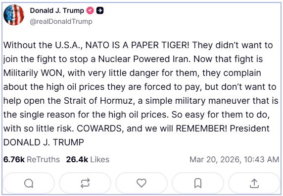 Cuestionó también que sus socios europeos “no quieren ayudar a abrir el estrecho de Ormuz; una simple maniobra militar que constituye la única razón de esos elevados precios del petróleo. Algo tan fácil de hacer para ellos, y con tan poco riesgo”.