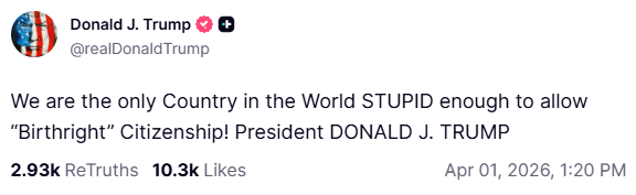 “¡Somos el único país del mundo lo suficientemente ESTÚPIDO como para permitir la ciudadanía por ‘derecho de nacimiento’!“, posteó el mandatario en su red Truth Social.