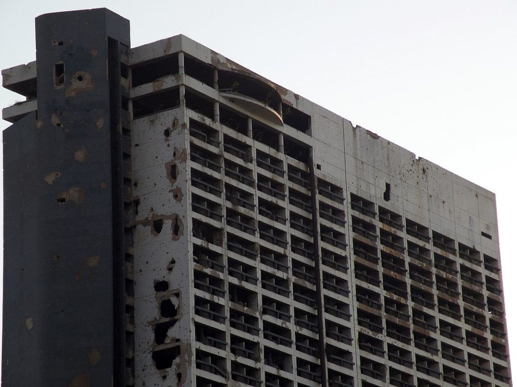 En plena costanera de Beirut un fantasma de cemento y 26 pisos se yergue como un recordatorio de un conflicto aún no olvidado. A diferencia de otros hoteles del barrio turístico de la capital, el Holiday Inn no ha sido restaurado hasta la fecha. Dañado durante el conflicto interno, el edificio ofrece encarna en cemento una paradoja histórica. El recinto fue inaugurado en 1974 en el contexto de una ciudad pujante que se preciaba de ser la joya del turismo en esa parte del mediterráneo: en poco más de un año el hotel se convertiría en un mar de balas. El elefante blanco pareciese resumir la historia de una sociedad que, en una soberbia virtual, no pudo sino que explotar debido a los problemas que no supo afrontar.