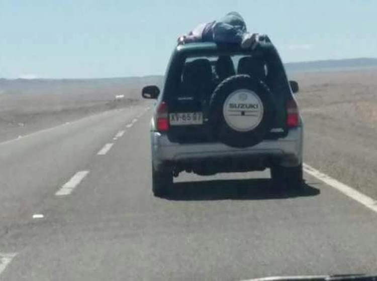 Puede ser que a varios se les haya pasado la mano con la celebración de Año Nuevo, pero nunca tanto como este joven que fue captado por unos conductores en la ruta que une Calama con San Pedro de Atacama, amarrado en la parte superior de un jeep.