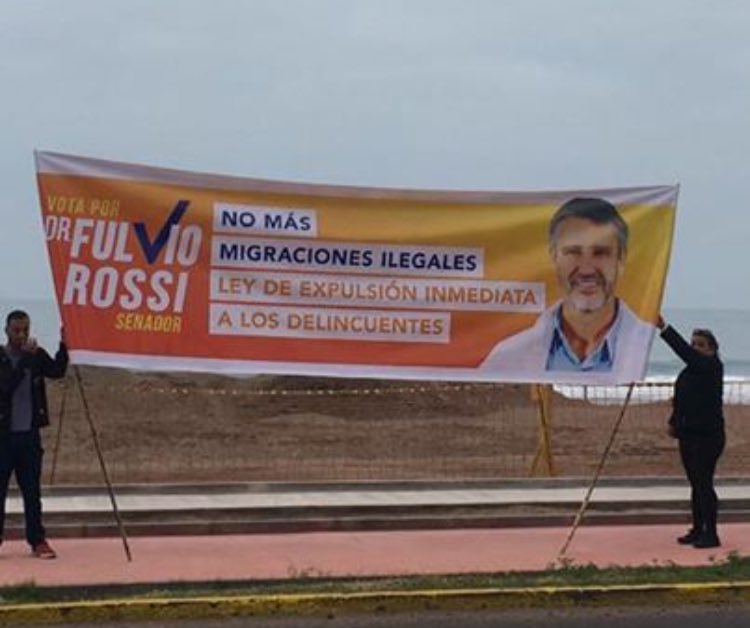 “No más migraciones ilegales. Ley de expulsión inmediata a los delincuentes“. Este es el polémico mensaje que se ve en un lienzo de campaña de Fulvio Rossi, candidato a senador por Tarapacá, el que generó una ola de críticas.