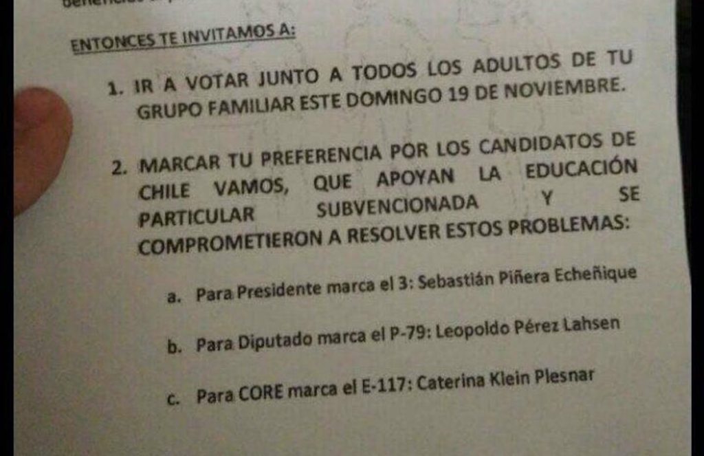 En esa línea, el director del establecimiento hace un llamado a votar este domingo 19 de noviembre, pero no solo eso, porque además indica a los padres por quiénes deben votar, mencionando a Piñera, Pérez y Klein. “Marcar tu preferencia por los candidatos de Chile Vamos, que apoyan la educación particular subvencionada y se comprometieron a resolver estos problemas”, afirma.