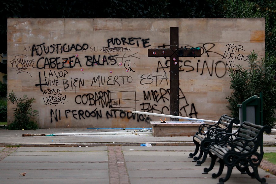 Con manchas de pintura, la tumba, que se encuentra casi a la entrada de la puerta principal del cementerio general de Santiago, fue rayada con frases como “traidor y asesino”, “cobarde” y “ni perdón ni olvido”.