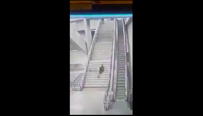 Pese a que en primera instancia lo lograron, uno de ellos no pudo cantar victoria tan fácilmente, porque mientras arrancaba de los guardias de seguridad, el joven cayó estrepitosamente por las escaleras, terminando en el piso.