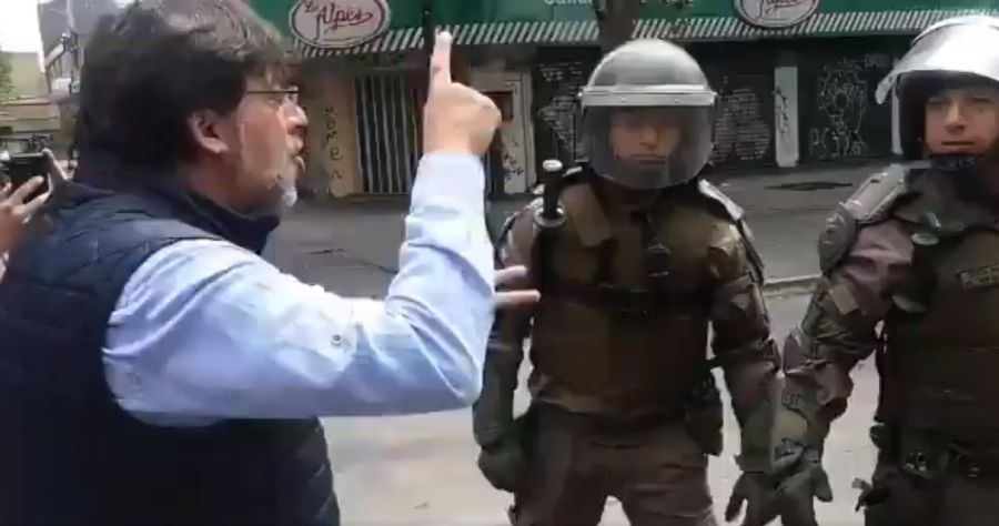 El alcalde de Recoleta, Daniel Jadue, increpó al personal de Fuerzas Especiales de Carabineros que llegó a la Plaza Italia para disolver una manifestación por el Estado de Emergencia decretado tras las fuertes protestas registradas en Santiago por el alza en el precio del transporte público.