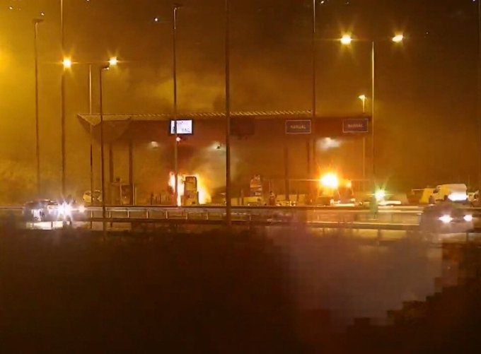 Un grupo de desconocidos quemaron las casetas de peaje del acceso lateral a la ruta Troncal Sur, a la altura de Villa Olímpica en Quilpué, Región de Valparaíso.