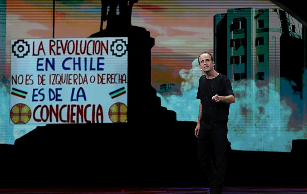 La rutina del imitador en Viña 2020 circuló de manera cronológica por el estallido social, desde el 18 de octubre en adelante. En un momento se refirió a la “primera línea” como los que permiten “que el resto se manifieste” y subió al escenario a distintos íconos de las protestas: el Sensual Spiderman, Baila Pikachu, Pareman, Nalcaman, entre otros.