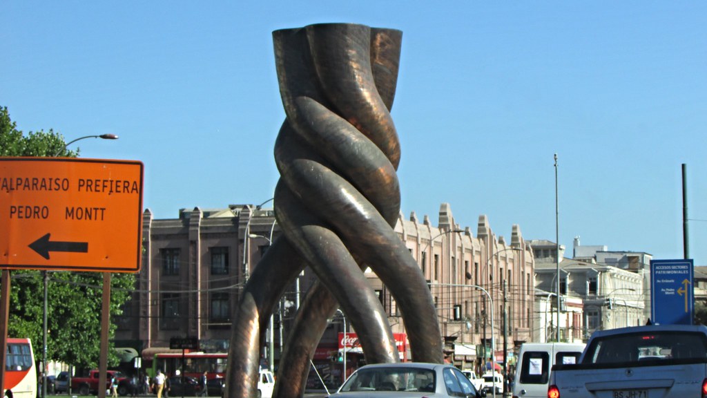 La obra que está en Avenida Argentina, que tiene 12 metros de alto y está revestida de láminas de cobre, es del artista Mario Irarrázabal.