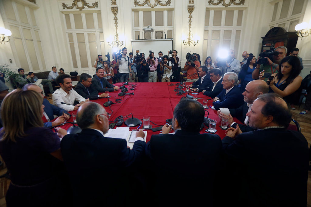 A la cita en el ex Congreso llegaron los presidentes de la Cámara Alta y Baja, Jaime Quintana (PPD) e Iván Flores (DC), junto a los timoneles de partidos Álvaro Elizalde (PS), Heraldo Muñoz (PPD), Fuad Chahín (DC), Mario Desbordes (RN) y Jacqueline Van Rysselberghe (UDI), que llegó atrasada.