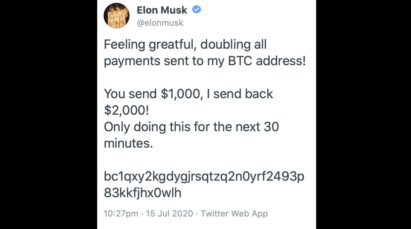 “Todo el mundo me pregunta cómo puedo dar de vuelta, y ahora es el momento. Estoy doblando todos los pagos enviados a mi cuenta de Bitcoin por los próximos 30 minutos. Si tú me mandas U$1.000, yo te enviaré U$2.000”, señalaban los tuits, que comenzaron a ser borrados de las cuentas oficiales.