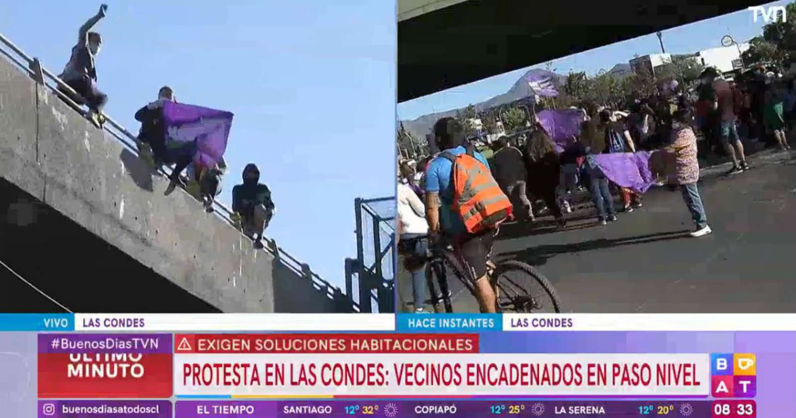 Ahora (08:07) manifestaciones por demandas habitacionales restringen pistas en sector de la Rotonda Atenas y en paso sobre nivel de Av. Cristóbal Colón en #LasCondes. Precaución. Imagen de @T13 pic.twitter.com/XUqEZGuoUe